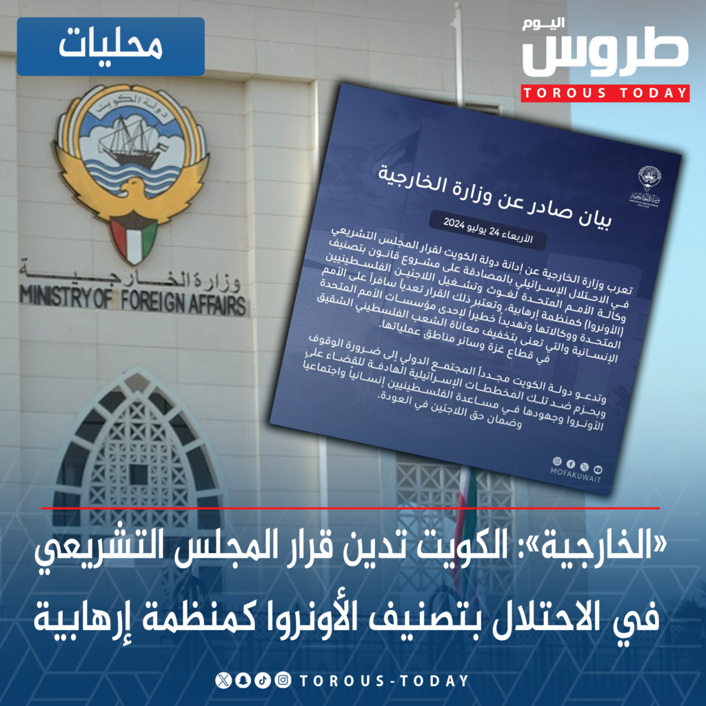 أعبرت وزارة الخارجية عن إدانة دولة الكويت لقرار المجلس التشريعي في الاحتلال الإسرائيلي بالمصادقة على مشروع قانون بتصنيف وكالة الأمم المتحدة لغوث وتشغيل اللاجئين الفلسطينيين (الأونروا) كمنظمة إرهابية، وتعتبر ذلك القرار تعدياً سافراً على الأمم المتحدة ووكالاتها وتهديداً خطيراً لإحدى مؤسسات الأمم المتحدة الإنسانية والتي تعنى بتخفيف معاناة الشعب الفلسطيني الشقيق في قطاع غزة وسائر مناطق عملياتها. وتدعو دولة الكويت مجدداً المجتمع الدولي إلى ضرورة الوقوف وبحزم ضد تلك المخططات الإسرائيلية الهادفة للقضاء على الأونروا وجهودها في مساعدة الفلسطينيين إنسانياً واجتماعياً وضمان حق اللاجئين في العودة.