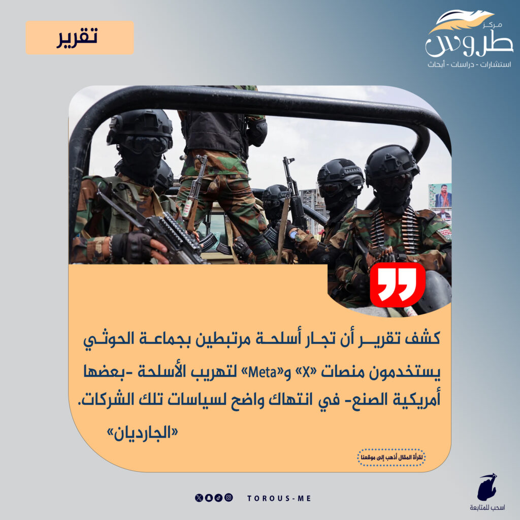 نختتم جولة هذا الأسبوع من صحيفة «الجارديان»، وخبرها بعنوان «تجار أسلحة مرتبطون بالحوثيين يبيعون السلاح عبر منصتي إكس وواتساب»، وجاء فيه، «كشف تقرير أن تجار أسلحة مرتبطين بجماعة الحوثي المسلحة في اليمن يستخدمون منصات «X» و«Meta» لتهريب الأسلحة -بعضها أمريكية الصنع- في انتهاك واضح لسياسات تلك الشركات.