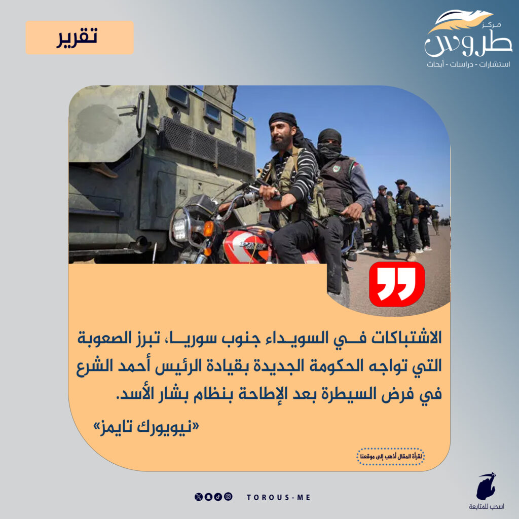 نستمر مع الشأن السوري ولكن مع صحيفة «نيويورك تايمز»، وخبرها بعنوان «العنف يهدد السلام الهش في سوريا»، وجاء فيه، «الاشتباكات، التي وقعت في محافظة السويداء جنوب سوريا، تبرز صعوبة الحكومة الجديدة بقيادة الرئيس أحمد الشرع في فرض السيطرة بعد الإطاحة بنظام بشار الأسد في ديسمبر الماضي. وقد قاومت الميليشيات الدرزية جهود الحكومة لدمج جميع الجماعات المسلحة تحت سلطتها.