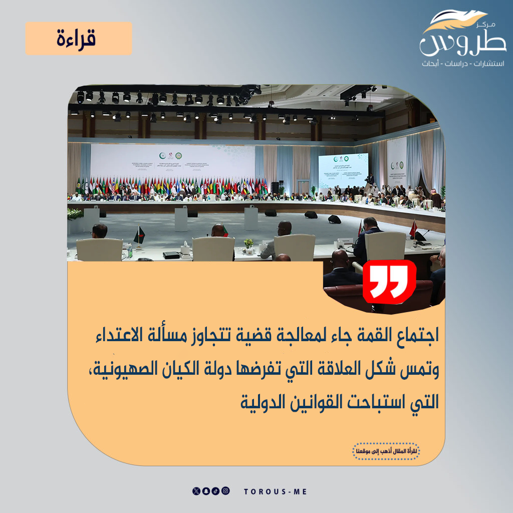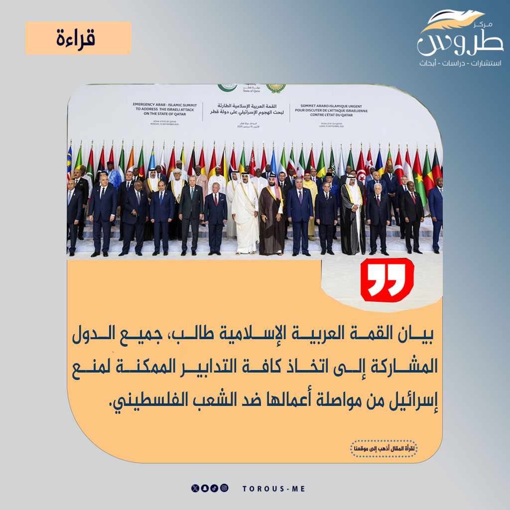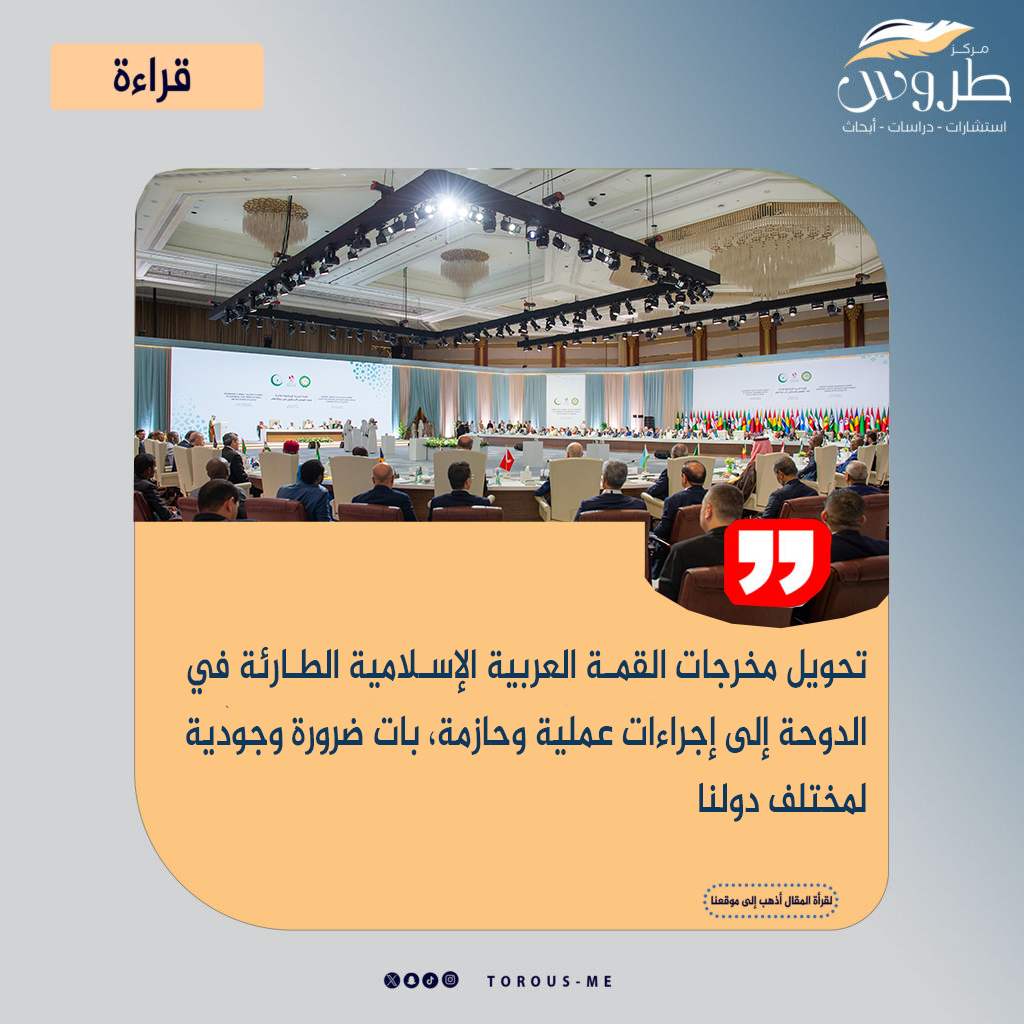 لذلك كله فإن تحويل مخرجات القمة العربية الإسلامية الطارئة في الدوحة إلى إجراءات عملية وحازمة، بات ضرورة وجودية لمختلف دولنا.. ويبقى محسوبًا للقمة سرعة انعقادها ورفعة مستوى تمثيل الحضور كدليل على وعي خاص بخطورة المرحلة – رغم التهاون بإدراك خطورة استراتيجية الكيان الحالية- جراء العدوان الإسرائيلى الأخير على دولة قطر.