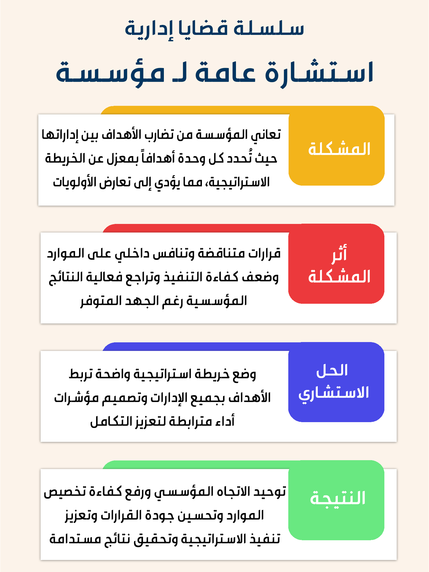 المؤسسة لا تعاني من ضعف كفاءات أو نقص موارد، بل من خلل في هندسة الأهداف الاستراتيجية. غياب المواءمة أدى إلى تفكك الاتجاه العام، وتحول الإدارات إلى مراكز قرار شبه مستقلة، بما يُضعف السيطرة على المسار الكلي.