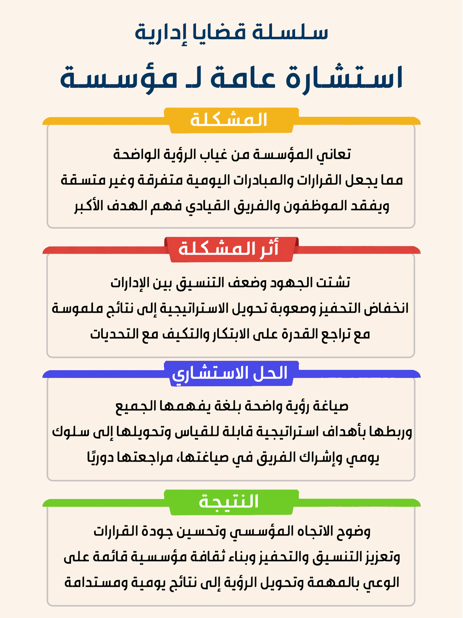 المؤسسة تعمل دون إطار واضح للرؤية، مما يجعل القرارات اليومية والمبادرات الاستراتيجية متفرقة وغير متسقة. كما يفتقد الموظفون والفريق القيادي لغة مشتركة لفهم الأهداف الكبرى، فتتضاءل القدرة على توجيه الجهود نحو تحقيق القيمة المؤسسية.