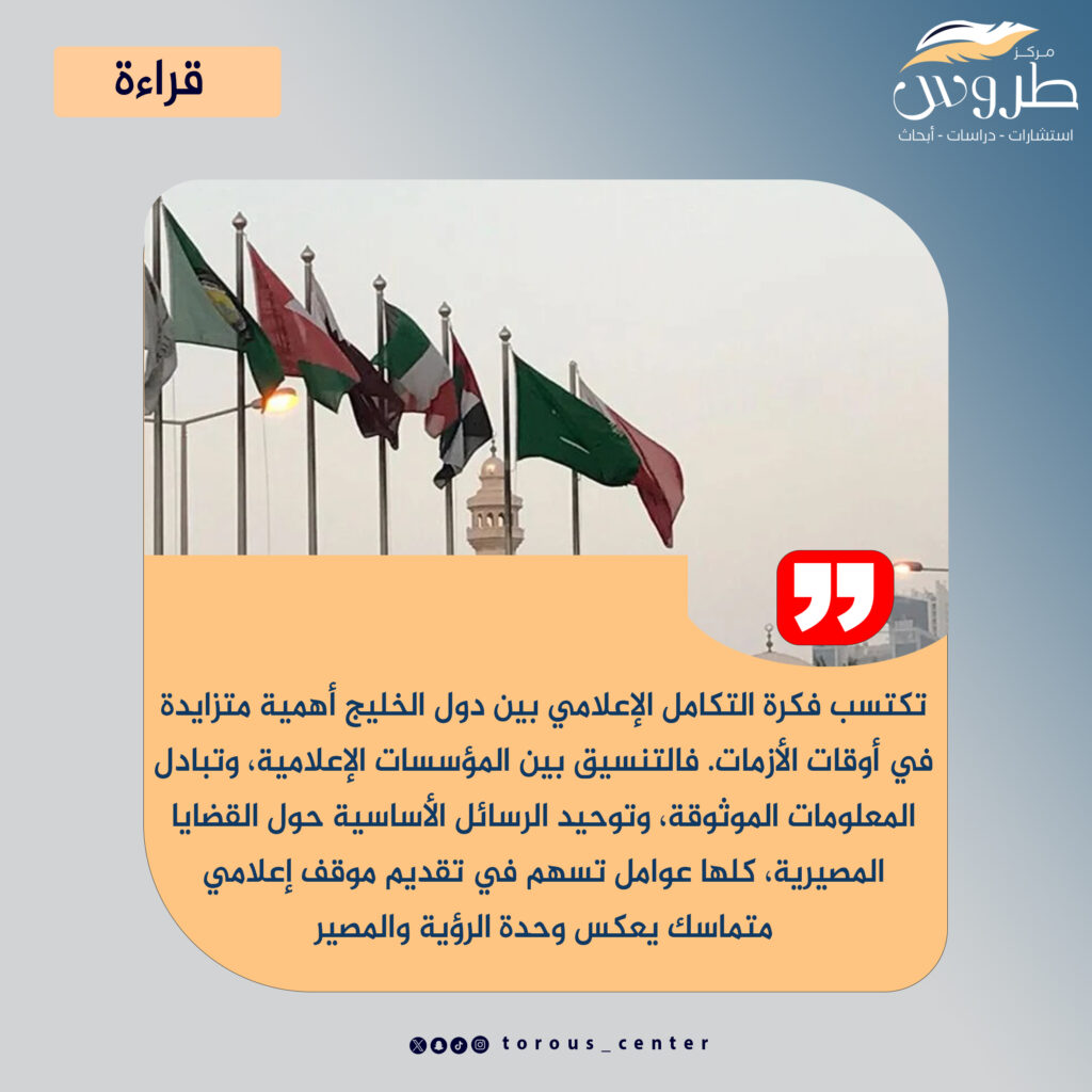 تكتسب فكرة التكامل الإعلامي بين دول الخليج أهمية متزايدة في أوقات الأزمات. فالتنسيق بين المؤسسات الإعلامية، وتبادل المعلومات الموثوقة، وتوحيد الرسائل الأساسية حول القضايا المصيرية، كلها عوامل تسهم في تقديم موقف إعلامي متماسك يعكس وحدة الرؤية والمصير.
