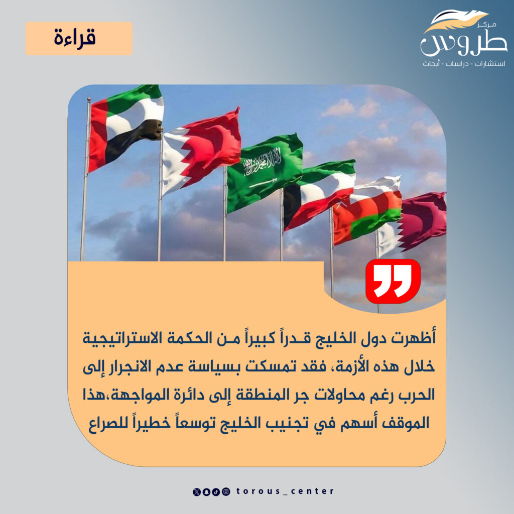 خلال هذه الأزمة، أظهرت دول الخليج قدراً كبيراً من الحكمة الاستراتيجية. فقد تمسكت بسياسة عدم الانجرار إلى الحرب رغم محاولات جر المنطقة إلى دائرة المواجهة. هذا الموقف أسهم في تجنيب الخليج توسعاً خطيراً للصراع، كان يمكن أن يفتح جبهات جديدة ويهدد استقرار المنطقة بأكملها.