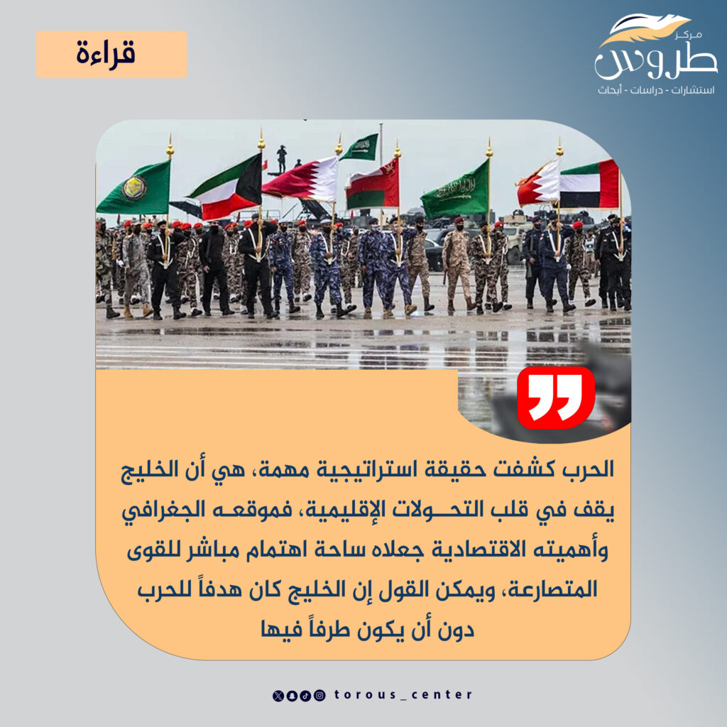 لكن هذه الحرب كشفت أيضاً حقيقة استراتيجية مهمة، هي أن الخليج يقف في قلب التحولات الإقليمية. فموقعه الجغرافي وأهميته الاقتصادية جعلاه ساحة اهتمام مباشر للقوى المتصارعة. ومن هنا يمكن القول إن الخليج كان هدفاً للحرب دون أن يكون طرفاً فيها.