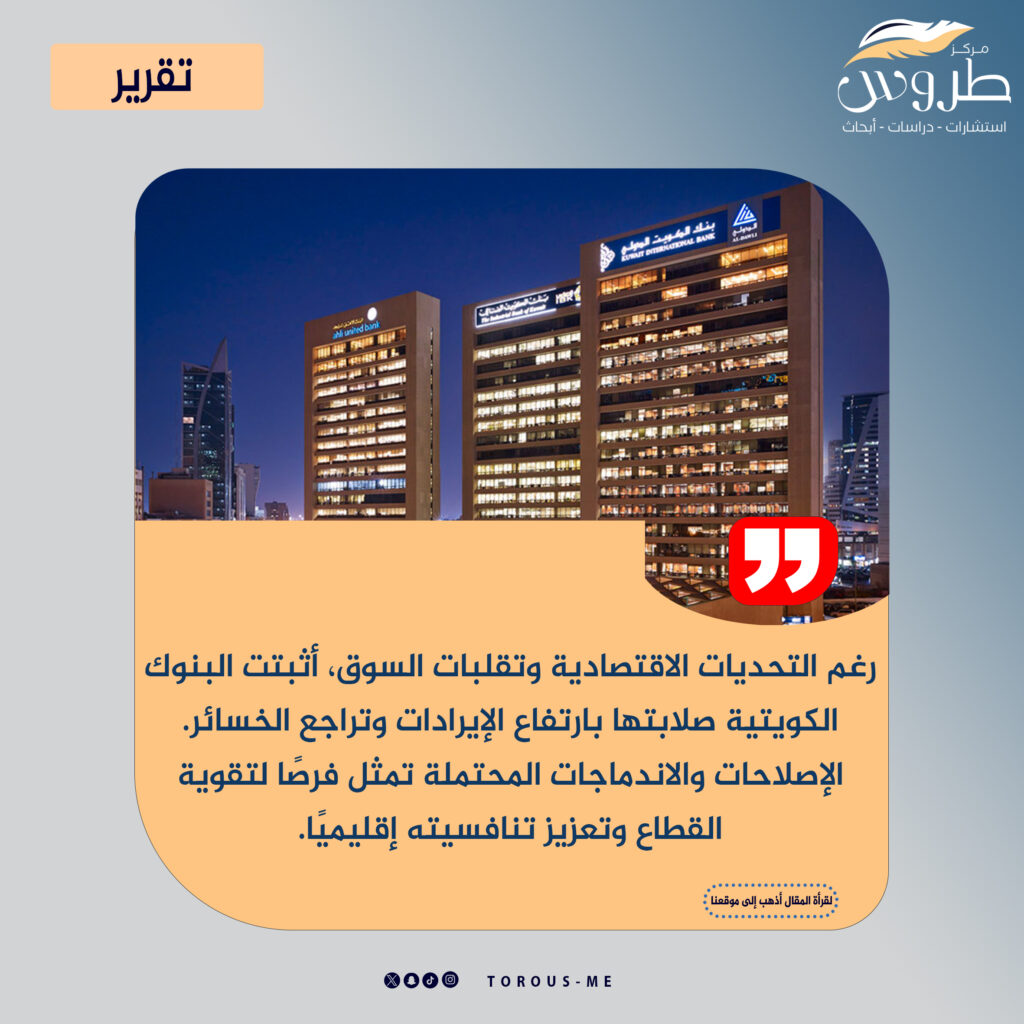 وتشهد البنوك الكويتية تحديات مهمة تتمثل في استقرار أسعار الفائدة، وتقلبات أسعار النفط التي تؤثر على الاقتصاد الوطني، مما يستدعي تعزيز التمويل للمشاريع التنموية الكبرى. كما تبرز فرص لتعزيز تنافسية القطاع عبر اندماجات محتملة بين بعض البنوك، مثل بنك الخليج وبنك بوبيان أو بنك وربة، بهدف تحسين الكفاءة وتعزيز مكانتها السوقية.