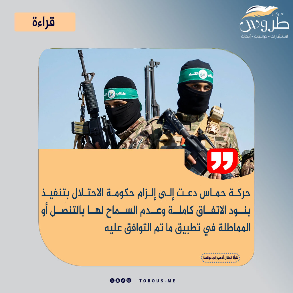 وفي ذات الوقت دعت الحركة إلى إلزام حكومة الاحتلال بتنفيذ بنود الاتفاق كاملة وعدم السماح لها بالتنصل أو المماطلة في تطبيق ما تم التوافق عليه.