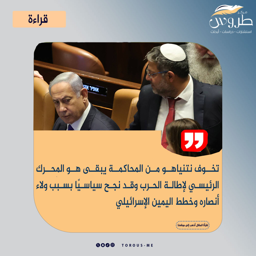 ختامـًا: يبقى تخوف نتنياهو من المحاكمة هو المحرك الرئيس عنده لإطالة الحرب وقد نجح سياسيًا بسبب ولاء أنصاره وخطط اليمين الإسرائيلي الذي التقى مع تطلعات نتنياهو الذي مزّق المجتمع الإسرائيلي داخلياً.. وفقد الكيان هالتها الأخلاقية في العالم لأنه بدا كقتل بلا أفق سياسي.