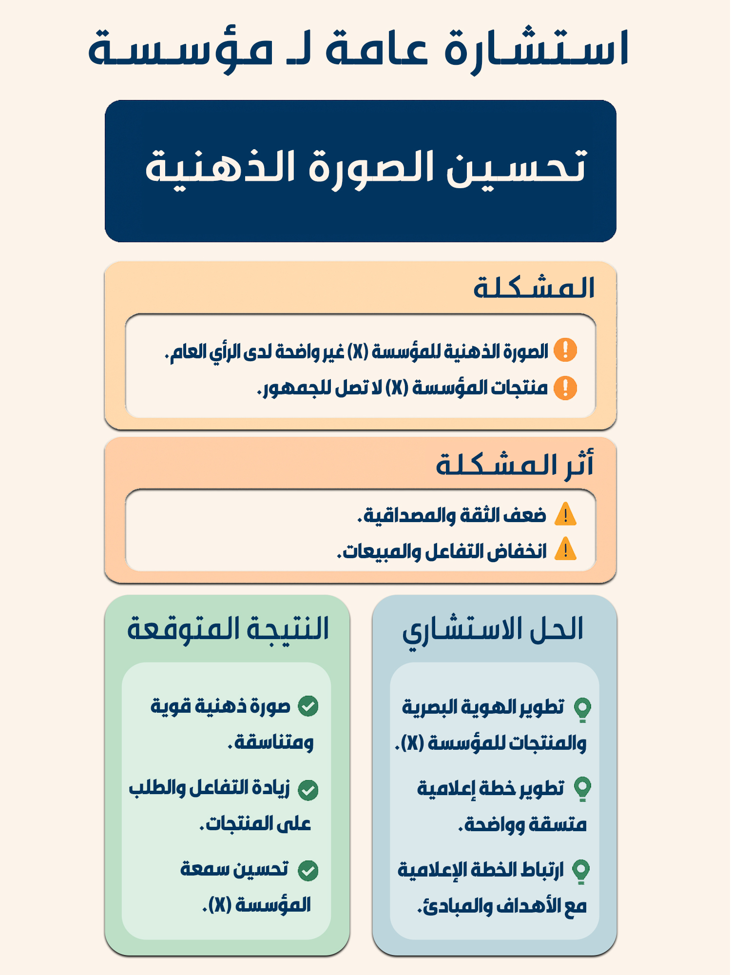 • تواجه المؤسسة (X) تحديًا في الصورة الذهنية (أداء المؤسسة الفعلي لا ينعكس على مستوى الانتشار).